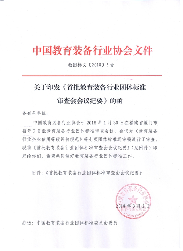 中国教育装备行业协会于2018年1月30日在福建省厦门市召开了首批教育装备行业团体标准审查会议。会议对《教育装备行业企业信用等级评价规范》等七项团体标准送审稿进行了审查。现将《首批教育装备行业团体标准审查会会议纪要》(见附件)印发给你们,希望共同做好教育装备行业团体标准工作。